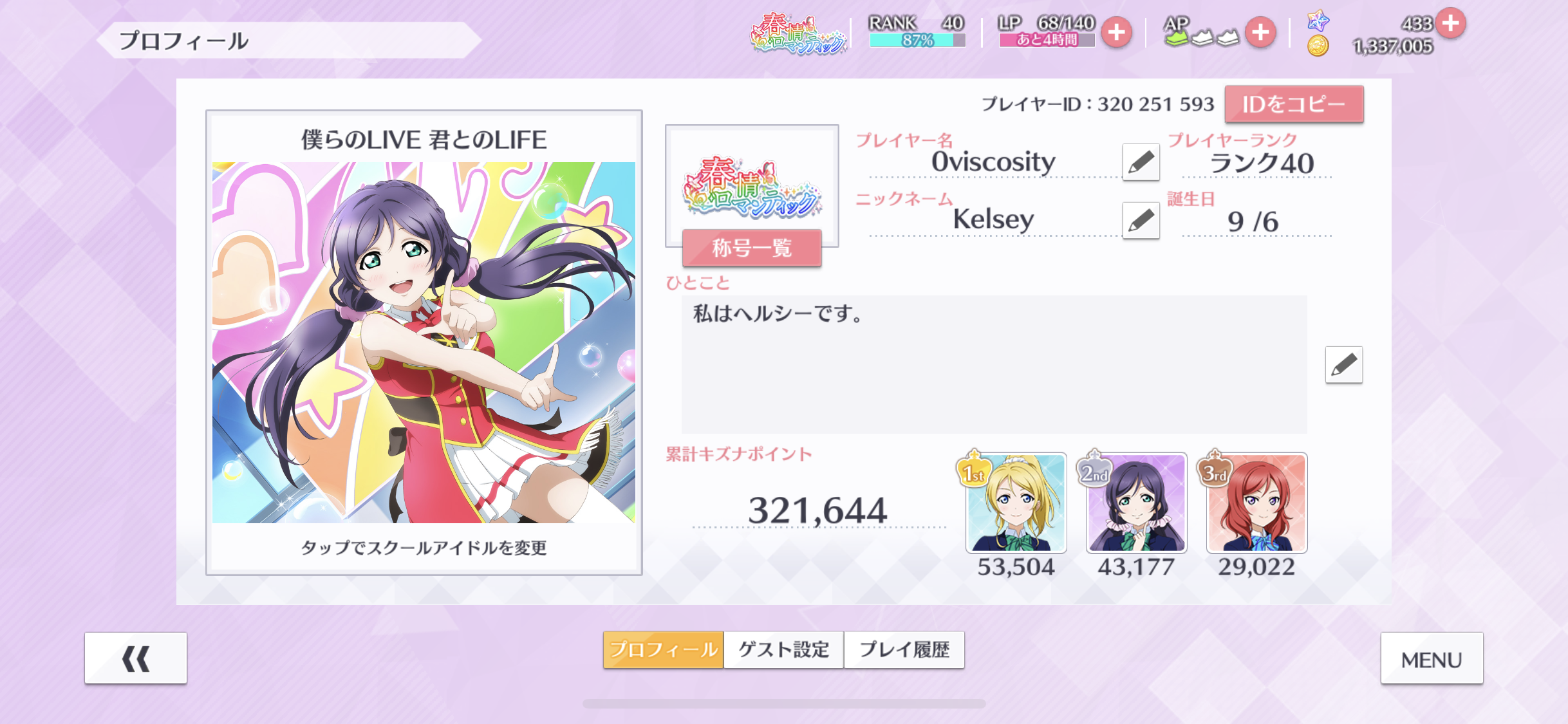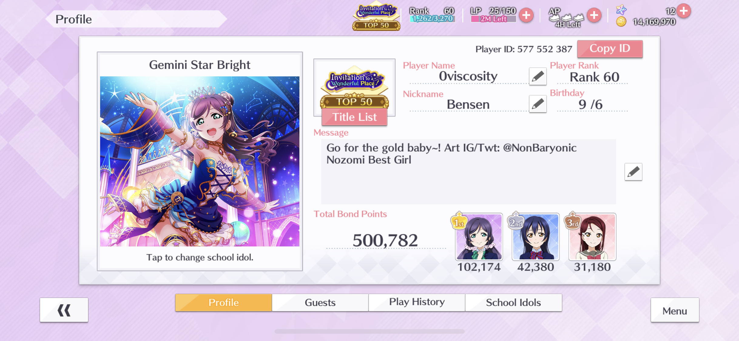 Wish I were whale enough to hold 1st place for Nozomi, but she will always be 1st place in my heart... :( Long time Love Live fan, especially Nozomi Tojo... Look forward to her event when it comes to WW :)